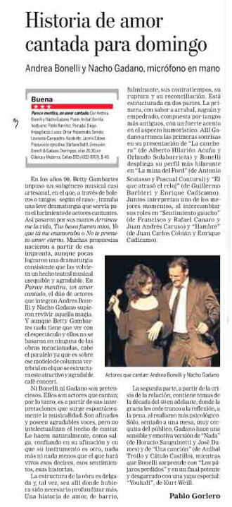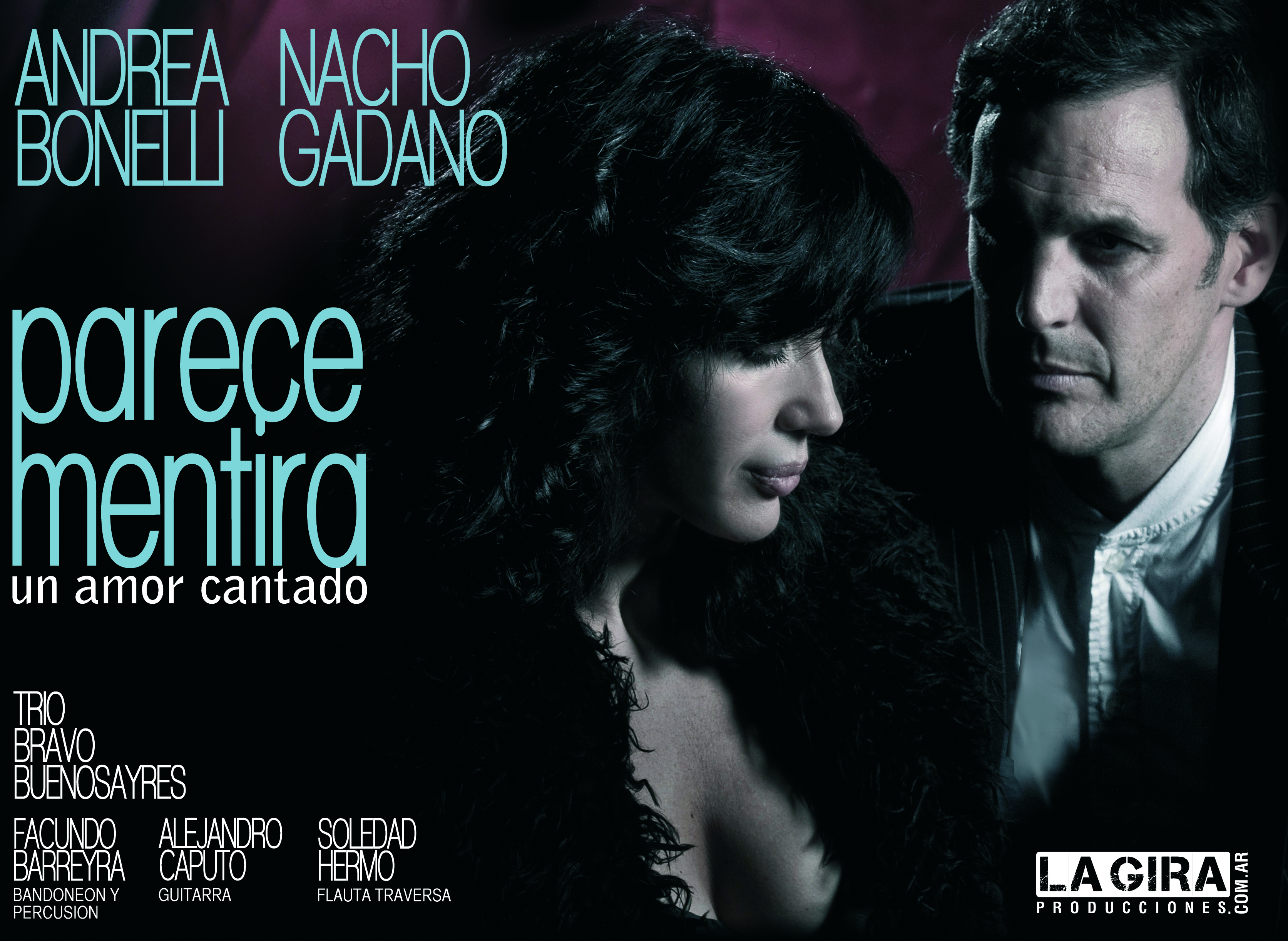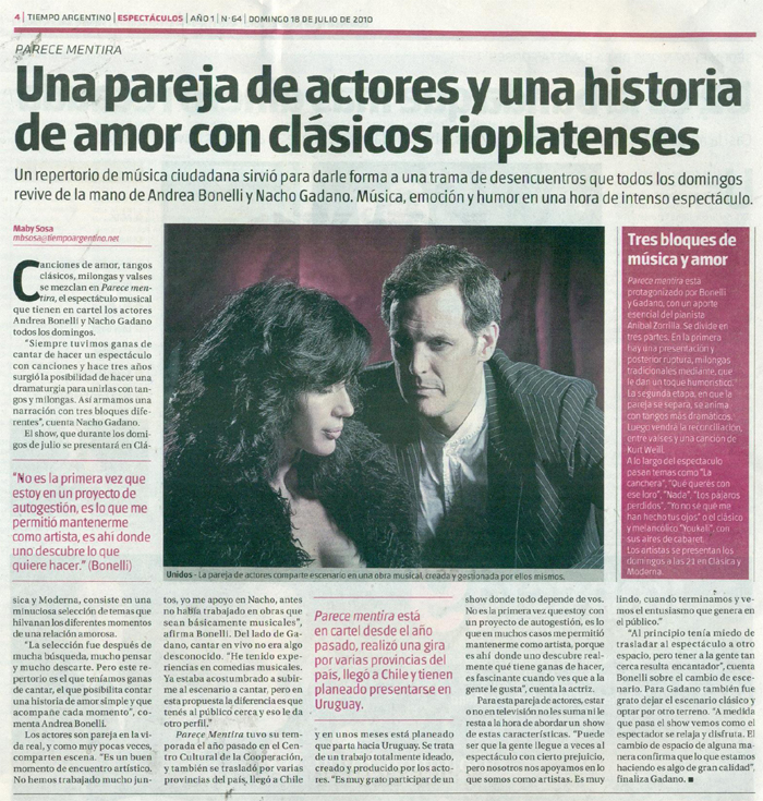 "Parece Mentira, un Amor Cantado" es un espectáculo encabezado por Andrea Bonelli y Nacho Gadano, que por primera vez en sus carreras interpretan canciones con una orquesta de músicos en vivo. Con el talentoso trío Bravobuenosayres conformado por Alejandro Caputo en Guitarra, Facundo Barreyra en Bandoneón y Soledad Hermo en flauta traversa, llevan adelante el marco musical de un amor cantado. A través de Parece Mentira y otros tangos, florecen las asombrosas voces de dos actores en un espectáculo teatral musical.
