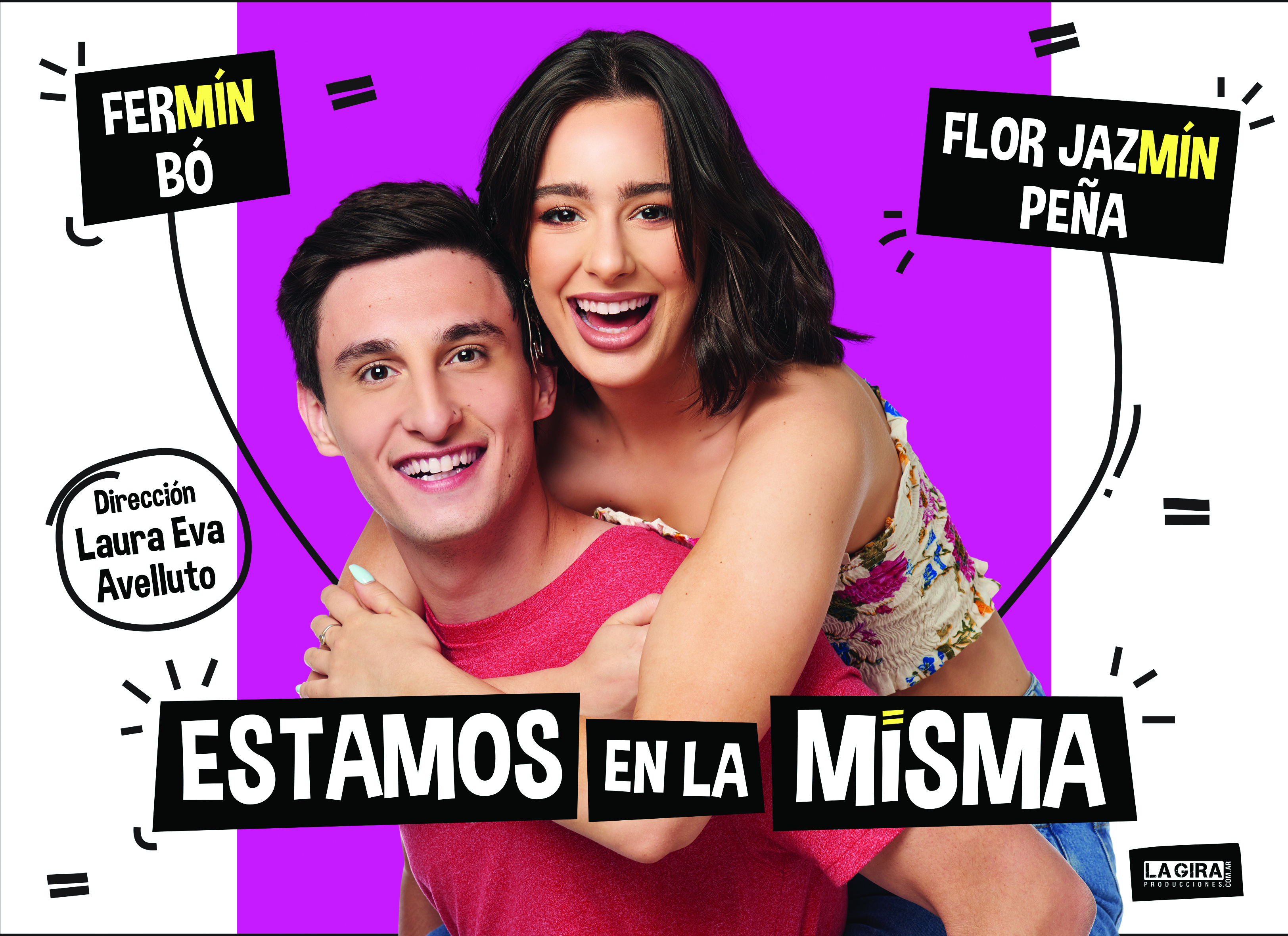 El mismo día que Flor y Ferbo se conocen para hacer una obra de teatro juntos, ella lo toma de la mano a él y le dice “estamos en la misma”, ahí nace el título de la obra escrita por ellos y Laura Avelluto, responsable también de la dirección general de ESTAMOS EN LA MISMA.
