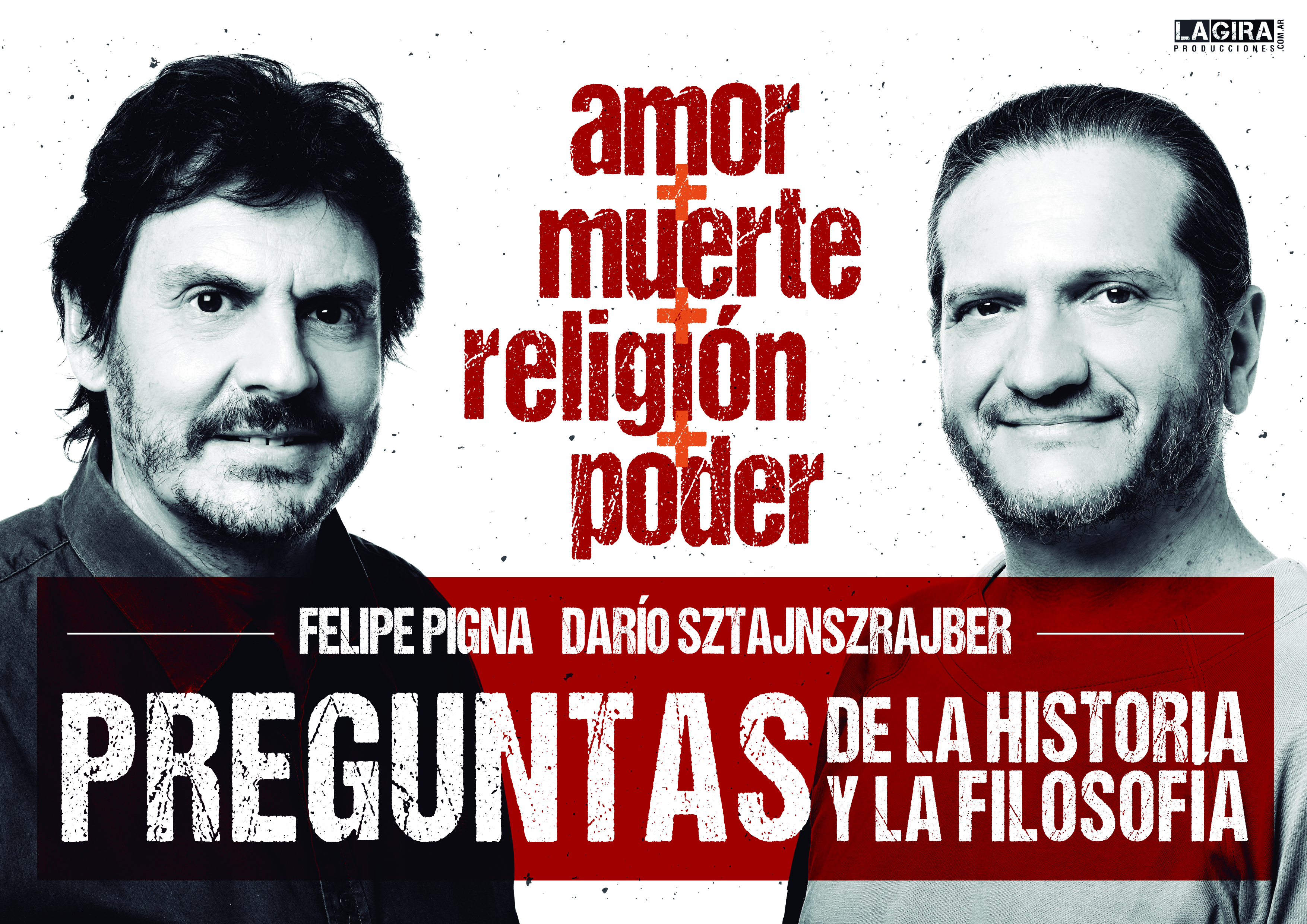 “De qué hablamos cuando hablamos del amor, la religión, el poder y la muerte. Felipe Pigna y Darío Sztajnszrajber presentan, junto a La Gira Producciones, "Preguntas de la Historia y la Filosofía", una charla imperdible y necesaria que intentará interpelar y cuestionar estos cuatro ejes fundamentales de nuestras vidas con la historia y la filosofía como herramientas de pensamiento crítico.